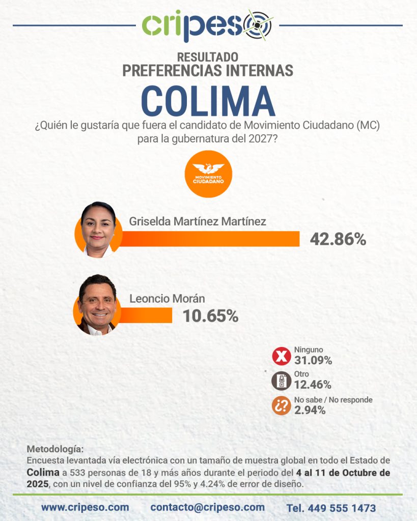 Para el partido Movimiento Ciudadano (MC) , Griselda Martínez Martínez es la favorita, con el 42.86% de la intención de voto. A pesar de esto, el 31.09% de los encuestados indicó «Ninguno/a». Leoncio Morán es el siguiente aspirante, con el 10.65%.