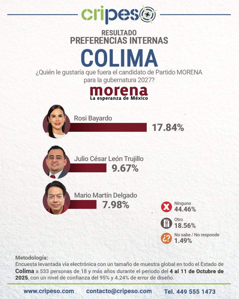 Al preguntar por el candidato de MORENA para la gubernatura de Colima 2027, el resultado principal fue que el 44.46% optó por la opción «Ninguno/a».