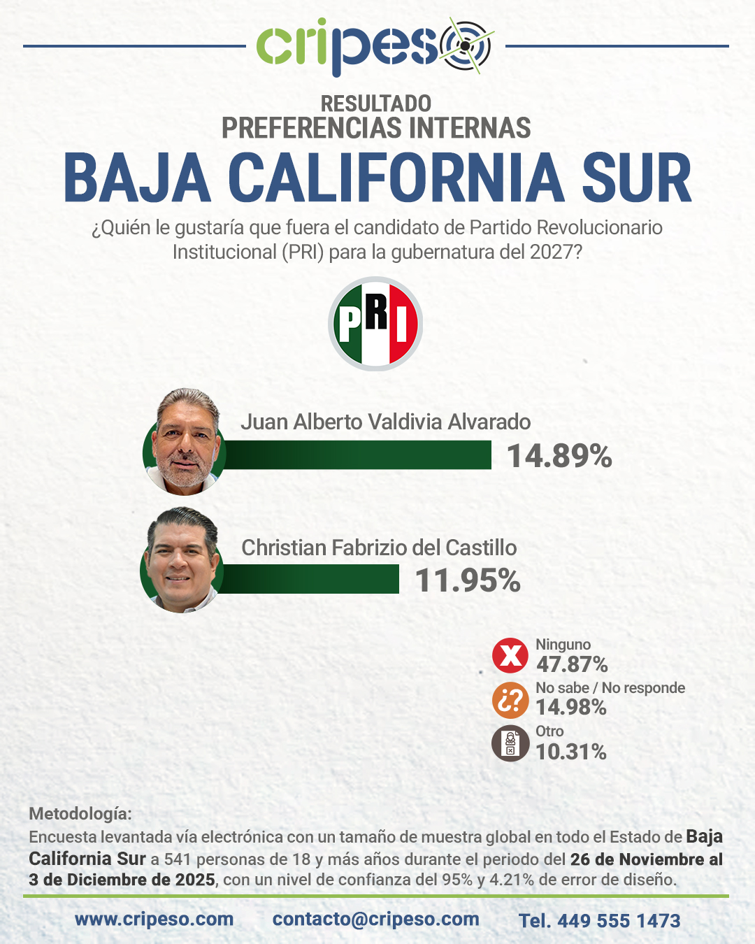 Comparte tu análisis en los comentarios y síguenos en redes sociales para no perderte las próximas mediciones. Comparte la publicación con el siguiente link: https://cripeso.com/encuesta-a-la-gubernatura-baja-california-sur-4-de-diciembre-de-2025/