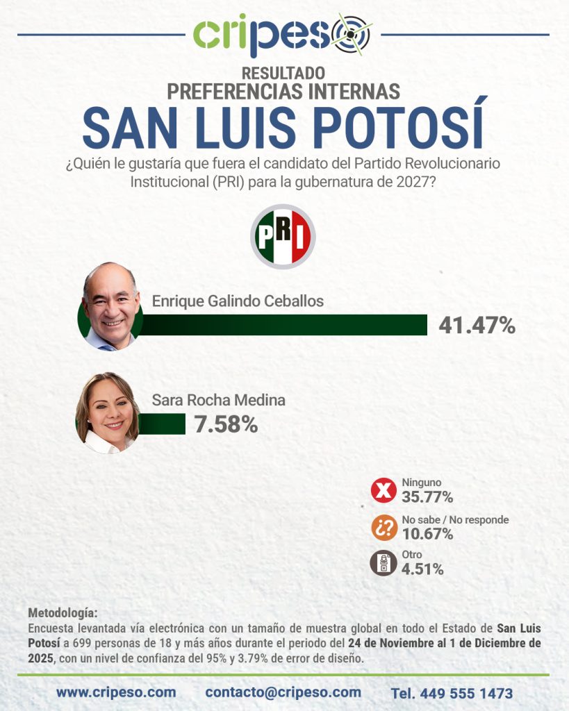 Enrique Galindo Ceballos se posiciona fuertemente como el aspirante a candidato por la Gubernatura de San Luís 2027 preferido por la ciudadanía, con una preferencia del 41.47%, Ceballos muestra una amplia ventaja. Muy por detrás, se encuentra Sara Rocha Medina con un 7.58%, siendo esta superada por la opción «Ninguno/a«.