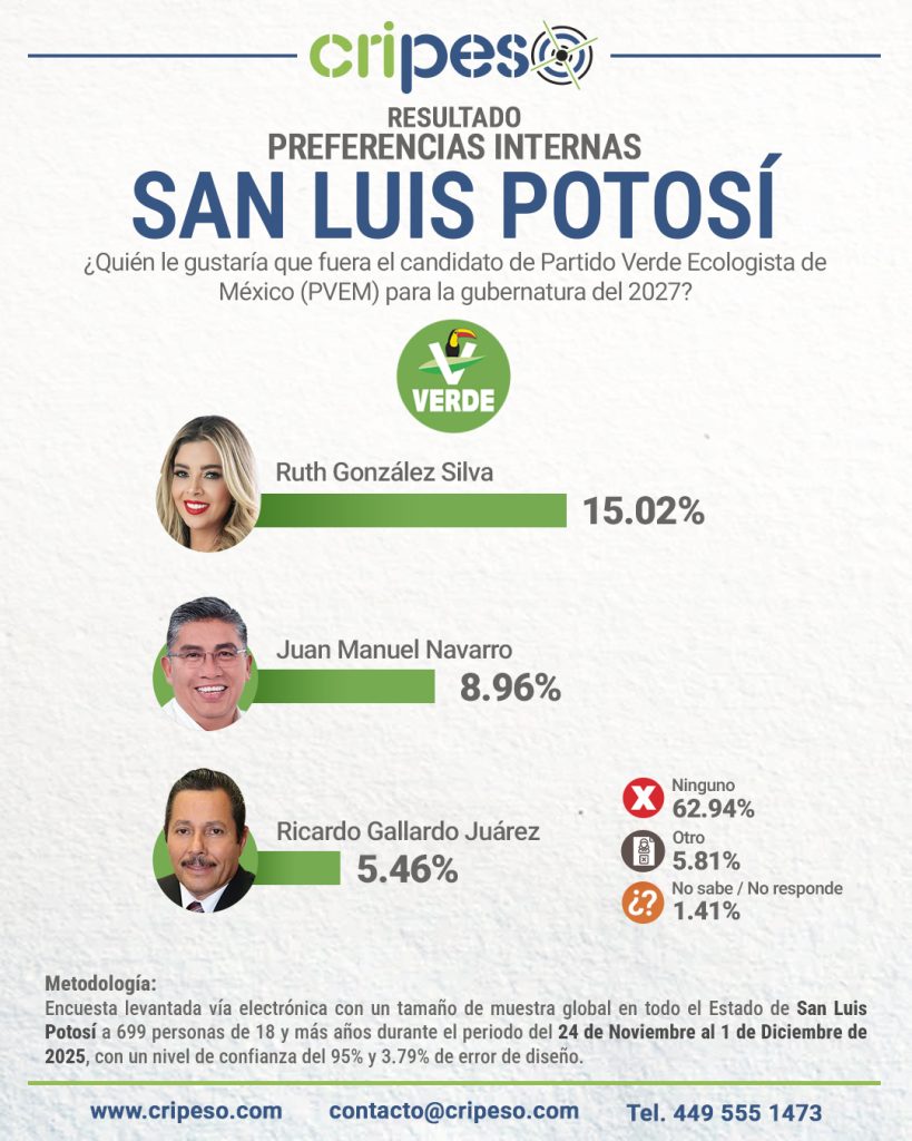 Entre los aspirantes a candidato para la Gubernatura de San Luís 2027, Ruth González Silva se posiciona en el primer lugar con un 15.02 por ciento. En segundo lugar se encuentra Juan Manuel Navarro con 8.96%, en tercer lugar Ricardo Gallardo Juárez con un 5.86 por ciento. Sin embargo, se ha mostrado una falta de decisión por parte de la ciudadanía, debido a que el 62.94% seleccionó a «Ninguno/a» como la opción preferida.