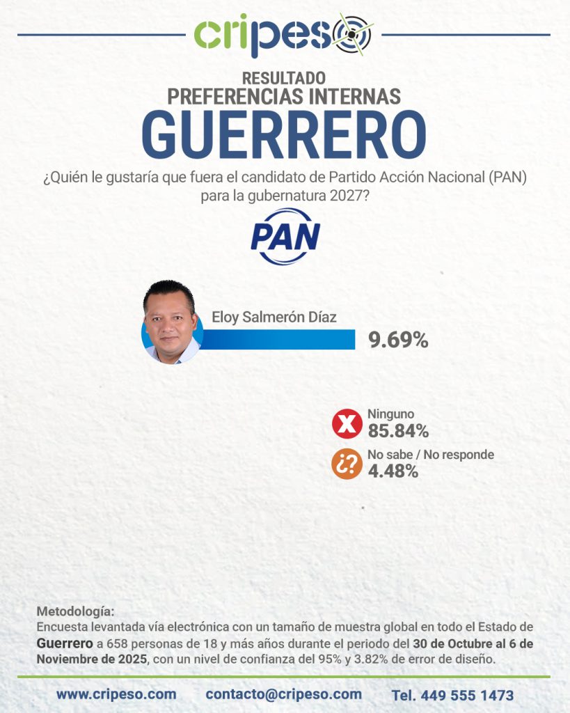 En la encuesta a la gubernatura de Guerrero 2027 por la contienda interna del PAN, solo Eloy Salmerón Díaz aparece en las preferencias electorales para 2027, alcanzando un 9.69% de apoyo.