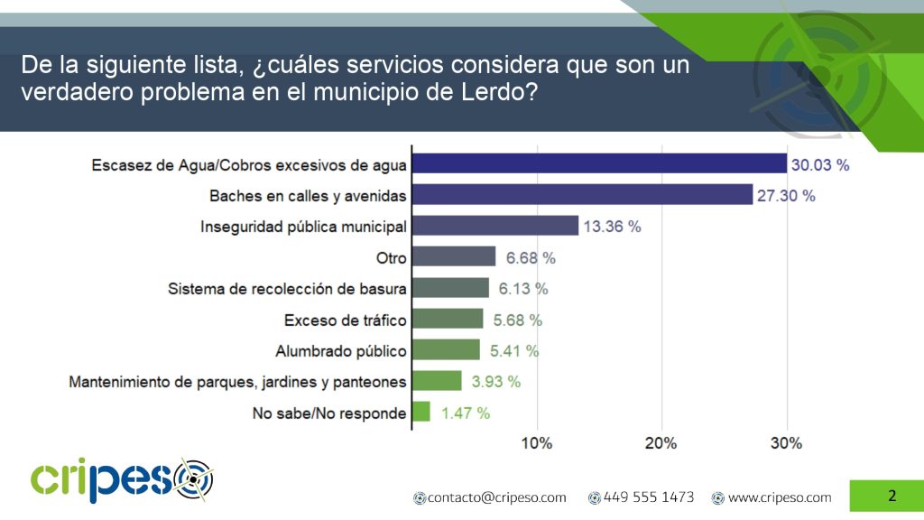 Con respecto a los servicios públicos municipales, el 30.03% de la población en Lerdo opinó que el principal problema es la “Escasez de Aguas/Cobros excesivos de agua”, seguido por el problema de “Baches en calles y avenidas” con el 27.30% de las respuestas y en tercer lugar la “Inseguridad pública municipal” con 13.36%.