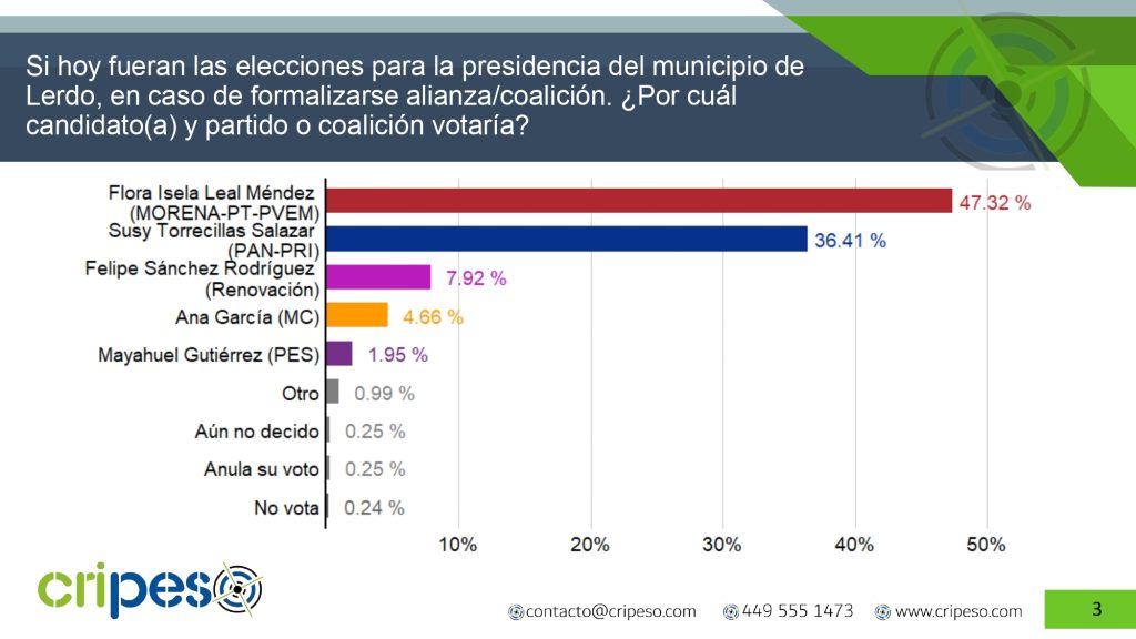Posteriormente se preguntó sobre su intención de voto para estas elecciones, el 47.32% manifestó que votará por la candidata de la coalición de MORENA-PT-PVEM Flora Isela Leal, mientras que el 36.41% mencionó que votará por la candidata de la coalición PAN-PRI Susy Torrecillas Salazar y 7.92% afirma que votaran por el candidato del partido Renovación Felipe Sánchez Rodríguez.