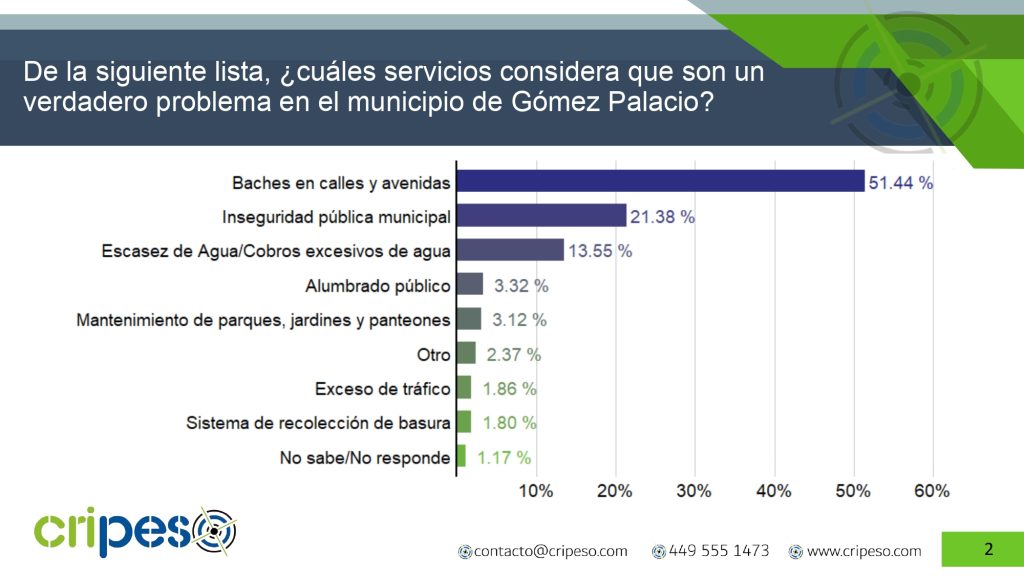 En base a los servicios públicos municipales, en Gómez palacio el 51.44% de la población considera a los “Baches en calles y avenidas” el problema principal de su municipio, posteriormente el 21.38% opina que la “Inseguridad pública municipal” es el segundo problema más grande, y en tercera posición se encuentra la opción “Escasez de agua/Cobros excesivos de agua” con 13.55% de las respuestas.