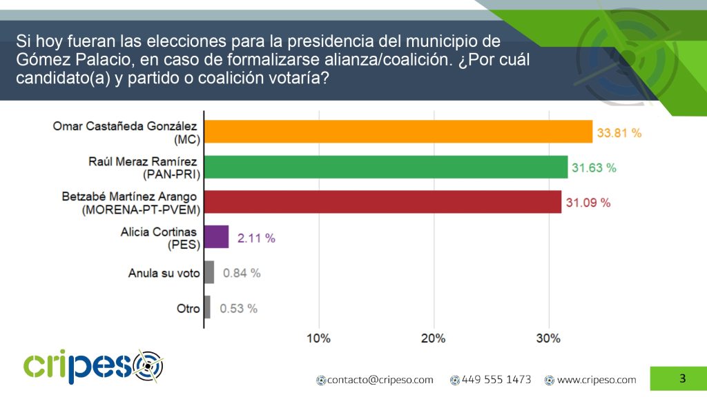 Este 1° de junio el municipio de Gómez Palacio del estado de Durangose acerca a su periodo de votaciones para renovar la presidencia municipal, es por ello que la empresa consultora CRIPESO realizó la tercera encuesta dirigida a la población de 18 años y más durante el periodo de levantamiento del 16 al 30 de abril, obteniendo de ésta manera los siguientes resultados: