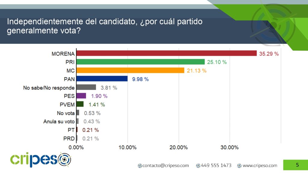 En cuanto a la intención de voto, los encuestados votaron de la siguiente manera, en primer lugar, al candidato del partido Movimiento Ciudadano Omar Castañeda González con 33.81% de los resultados, en segundo lugar, el candidato de la coalición PAN-PRI Raúl Meraz Ramírez Herrera con 31.63%, seguido por la candidata de la coalición MORENA-PT-PVEM Betzabé Martínez Arango obtuvo 31.09% de los votos.