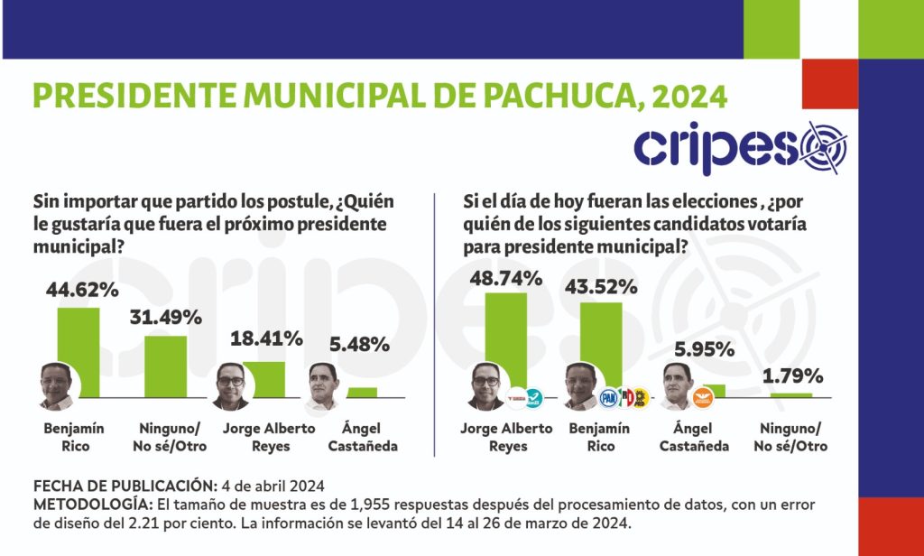 Por medio de la última encuesta realizada por CRIPESO para la Presidencia Municipal de Pachuca, durante el período del 14 al 26 de marzo, se da a conocer información sobre la percepción de la población de Pachuca de Soto, Hidalgo, en relación con su preferencia hacia los candidatos e intención de voto en las próximas elecciones.