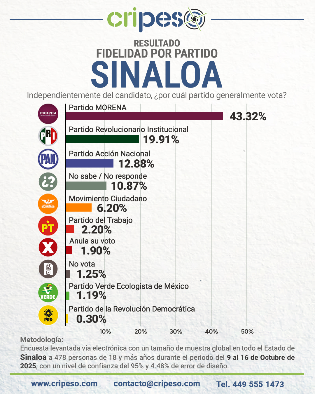 Al analizar la preferencia partidista general, la ENCUESTA SINALOA RUMBO A LA GUBERNATURA 2027 revela una clara ventaja para MORENA. Independientemente del candidato, un 43.32% de los sinaloenses señaló que generalmente vota por este partido.